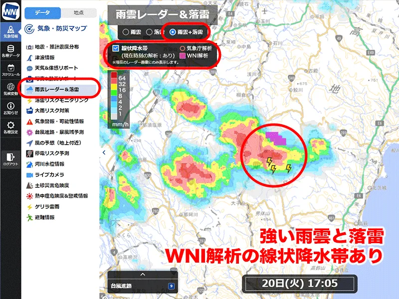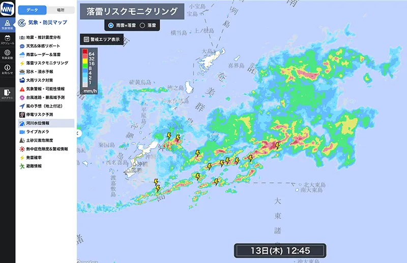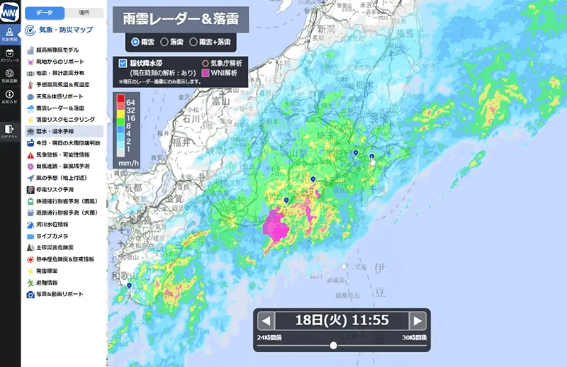 雨雲の動きや落雷、線状降水帯の状況を同時に確認することができ、ゲリラ雷雨や大雨をもたらす台風時の強雨・雷雨エリアの把握に役立ちます。