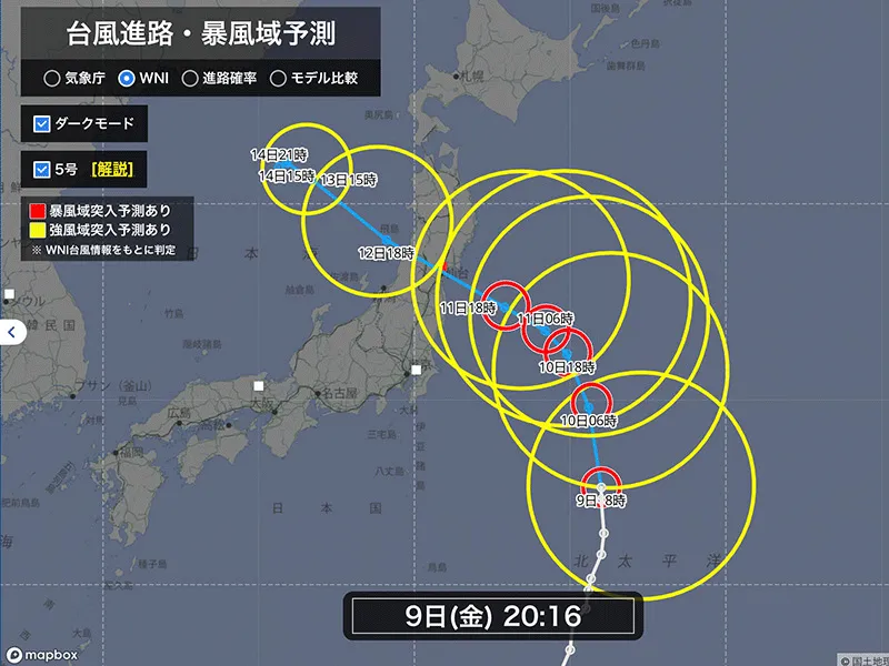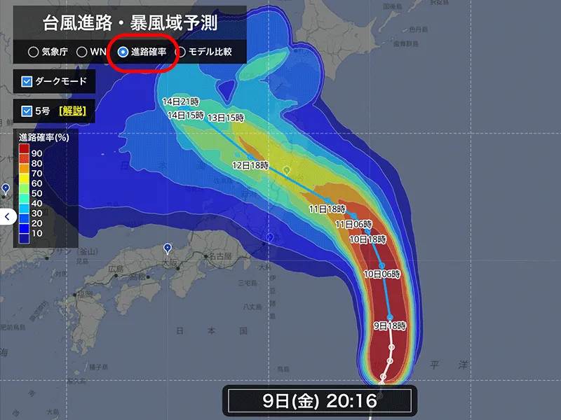 また、台風の中心位置が今後進む確率の高いエリアが最大10日先までわかります。