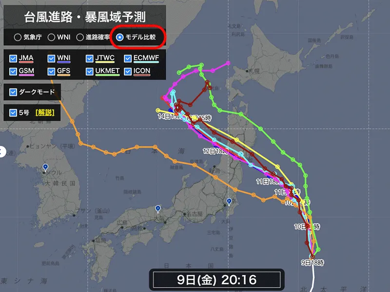 ウェザーニュースを加えて世界の7つの予報機関の進路予測が同時に比較できるため、確認した時点での台風進路ブレの大小が把握できます。