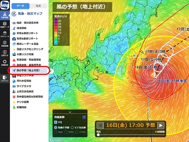 台風進路と重ね合わせることで、風の強まりやすいエリアがよりわかりやすくなります。