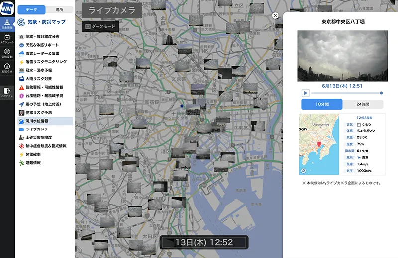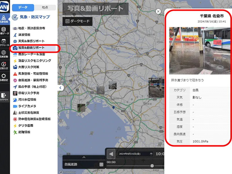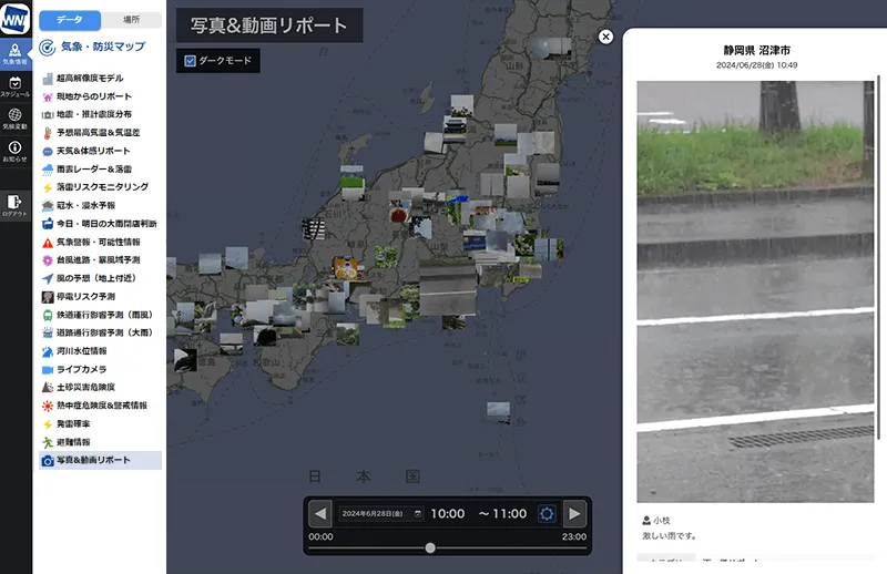 天気や季節の写真・動画リポートをマップに表示し、現在から過去のリポートを1時間単位でさかのぼって見ることができます。