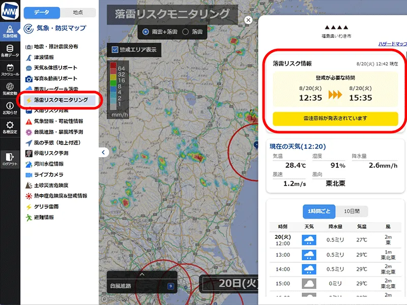 対象地点の半径30kmに赤い円が表示され、今後の落雷リスク情報が確認できます。