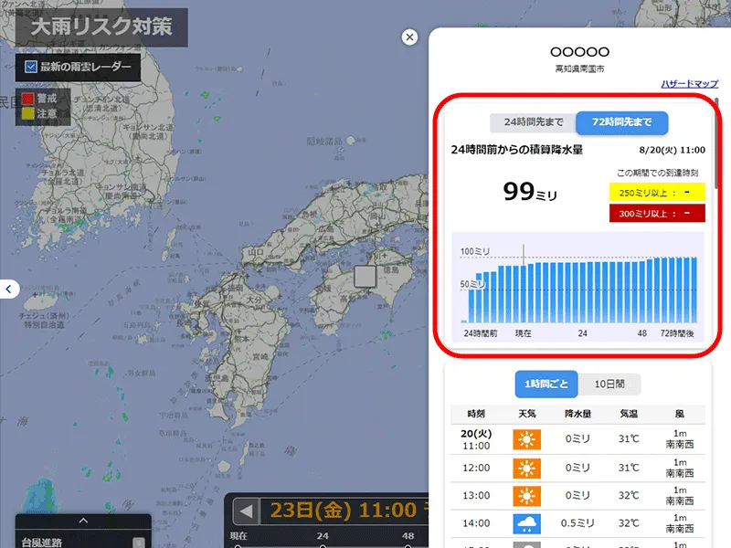 過去24時間の実況の積算雨量と今後72時間先までの積算雨量予測を合計した雨量予測を数値とグラフでご確認いただけます。