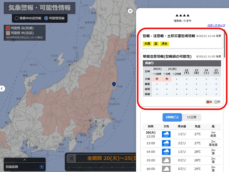 地点ごとの警報や注意報などの発表状況や早期注意情報(警報級の可能性)をご確認いただけます。