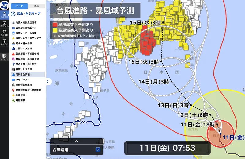 最新の気象庁台風情報に加え、ウェザーニュース独自台風進路予測及び強風域・暴風域予測などを確認でき、資料のPDFダウンロードも可能です。