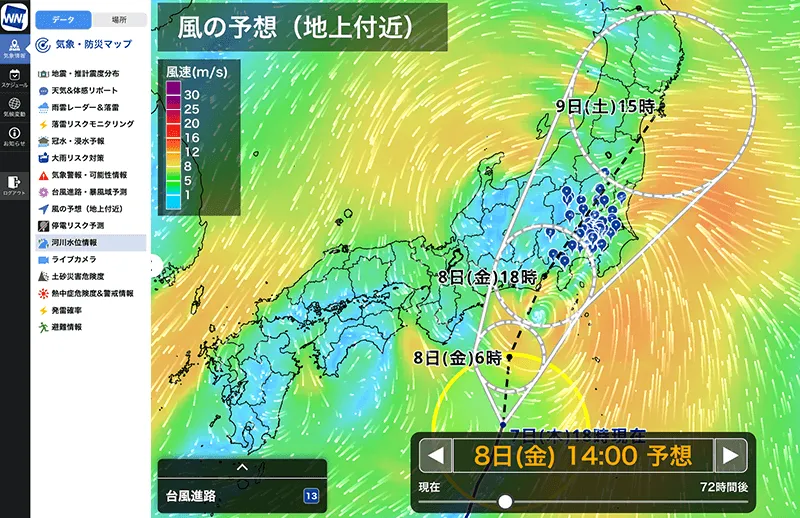 風の流れを流線のアニメーションで、風の強さをマップ上に色で表現し、風向や風速の細かい変化が直感的にわかりやすいのが特長です。